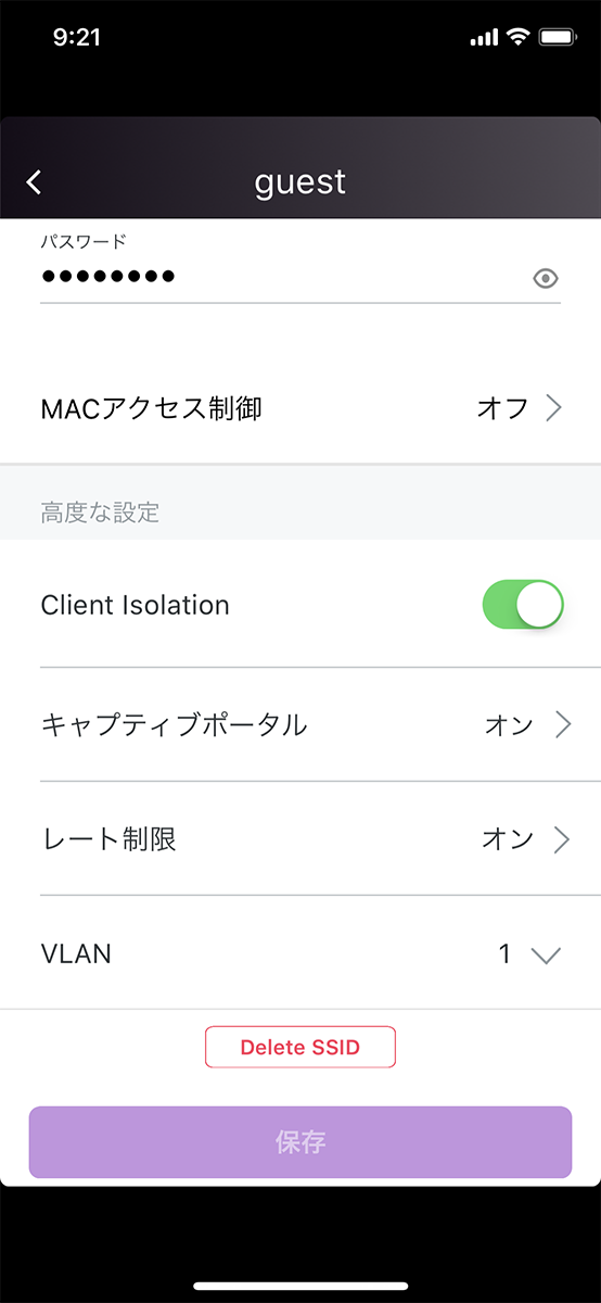 もちろん、パスワードだけでなく、クライアントの相互接続を禁止(Client Isolation)したり、キャプティブポータルの機能を有効化して、ゲスト接続の認証や接続時間制限を設定することなどもできる。