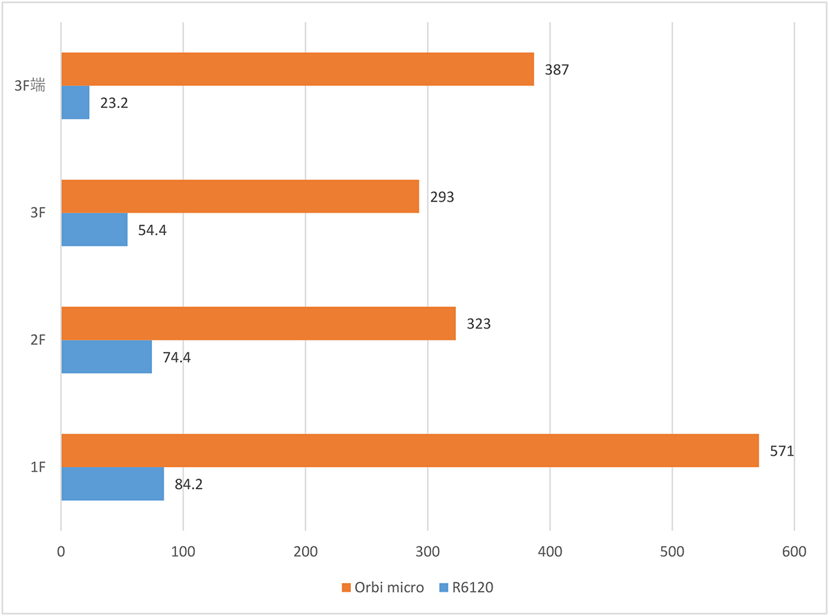 実際、エントリークラスのルーター単体(ネットギアR6120)とネットギアのトライバンドメッシュWiFiシステム「Orbi Micro(RBK20)」のパフォーマンスを木造三階建ての筆者宅にて計測してみたのが以下のグラフだ。