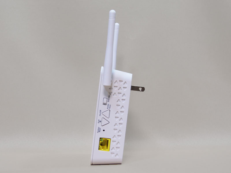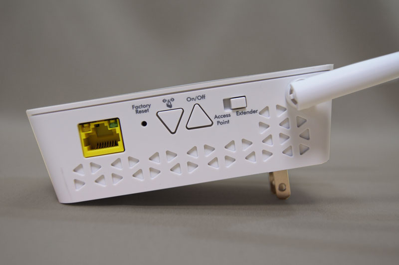 ボタンなどは側面に配置されており、エクステンダー/アクセスポイントで機能を切り替えるスイッチや電源ボタン、WPSボタン、有線LAN対応の機器を接続するためのLANポート(1000BASE-T対応)も搭載されている。