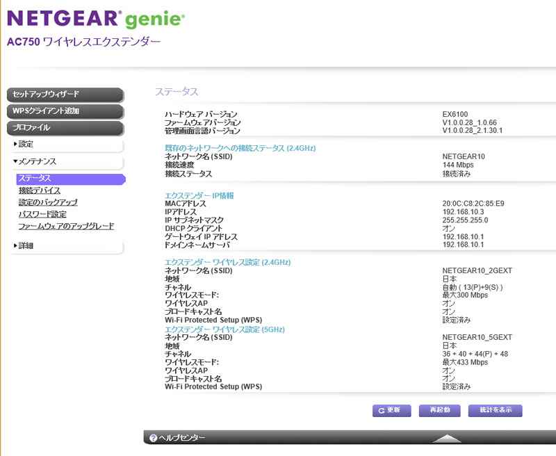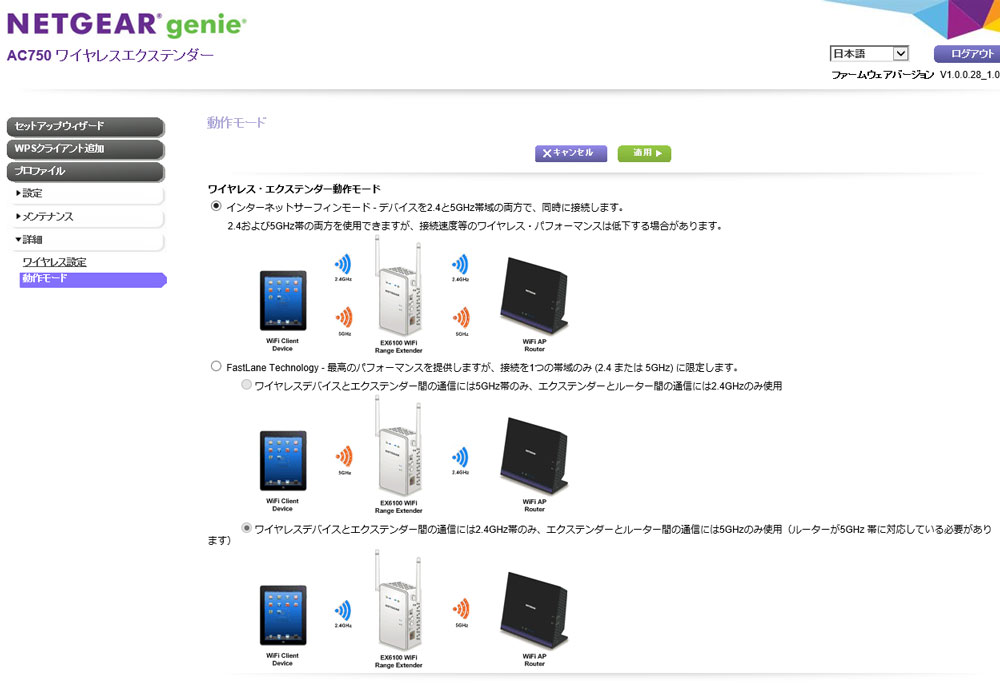 このように基本的には非常に手軽に利用できるEX6100だが、標準では「インターネットサーフィンモード」と呼ばれる設定になっており、既存の無線LANとの接続にも、クライアントとの接続にも、2.4GHz帯と5GHz帯の両方を利用するモードで動作する。