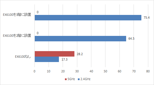 EX6100設置前の状態では、2.4GHz帯で17.3Mbps、5GHz帯で28.2Mbpsだったが、2階にEX6100(FastLaneモード)を設置した場合で64.5Mbps、3階に設置した場合で75.4Mbpsにまで改善することができた(FastLaneモードなのでクライアント側は両方とも2.4GHz接続)。