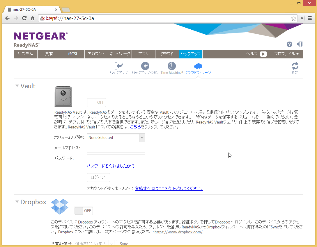 ReadyNAS Vaultの設定は、「バックアップ」メニューの「クラウドストレージ」の項目にあります。初回は登録が必要なので、「登録するにはここをクリックしてください」をクリックしましょう。