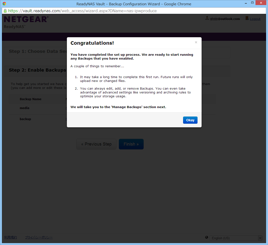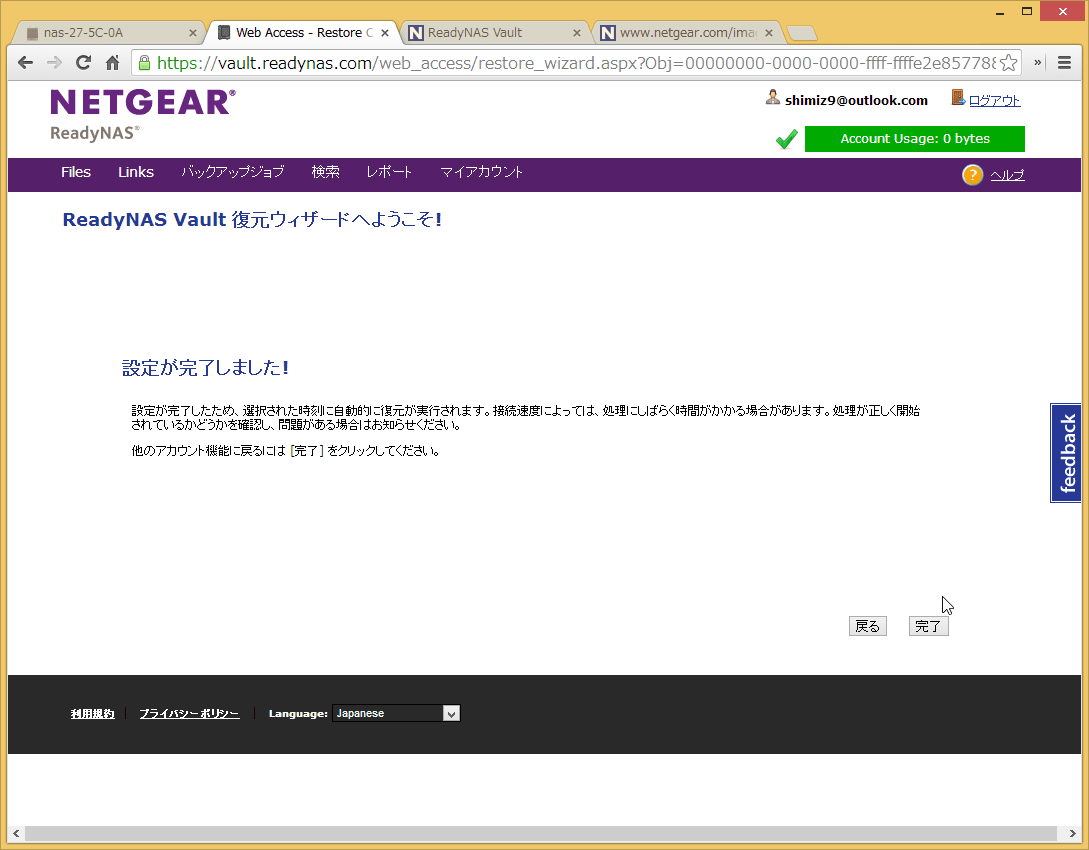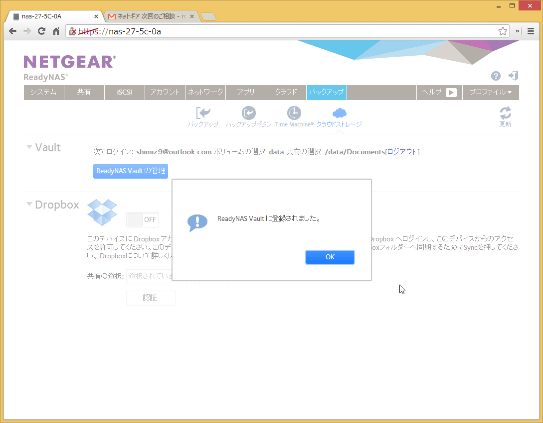 「登録」ボタンをクリックすると、ReadyNAS Vaultのサーバーとの間で設定が自動的に実行され、登録が完了します。