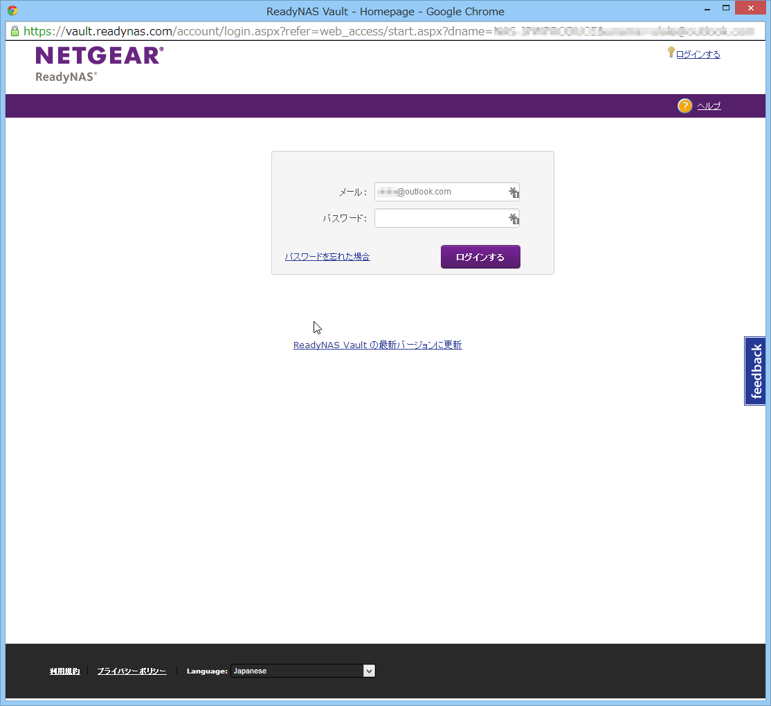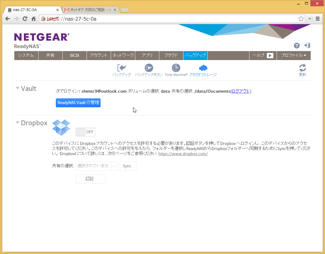 もちろん、より高度な設定をすることもできるので、サービスの管理画面にアクセスしてみましょう。ReadyNAS Vaultの設定画面から、「ReadyNAS Vaultの管理」をクリックすると、以下のように別ウィンドウでサービス設定ページにアクセスすることができます。