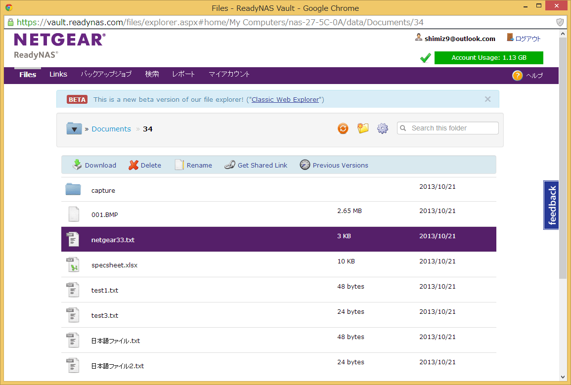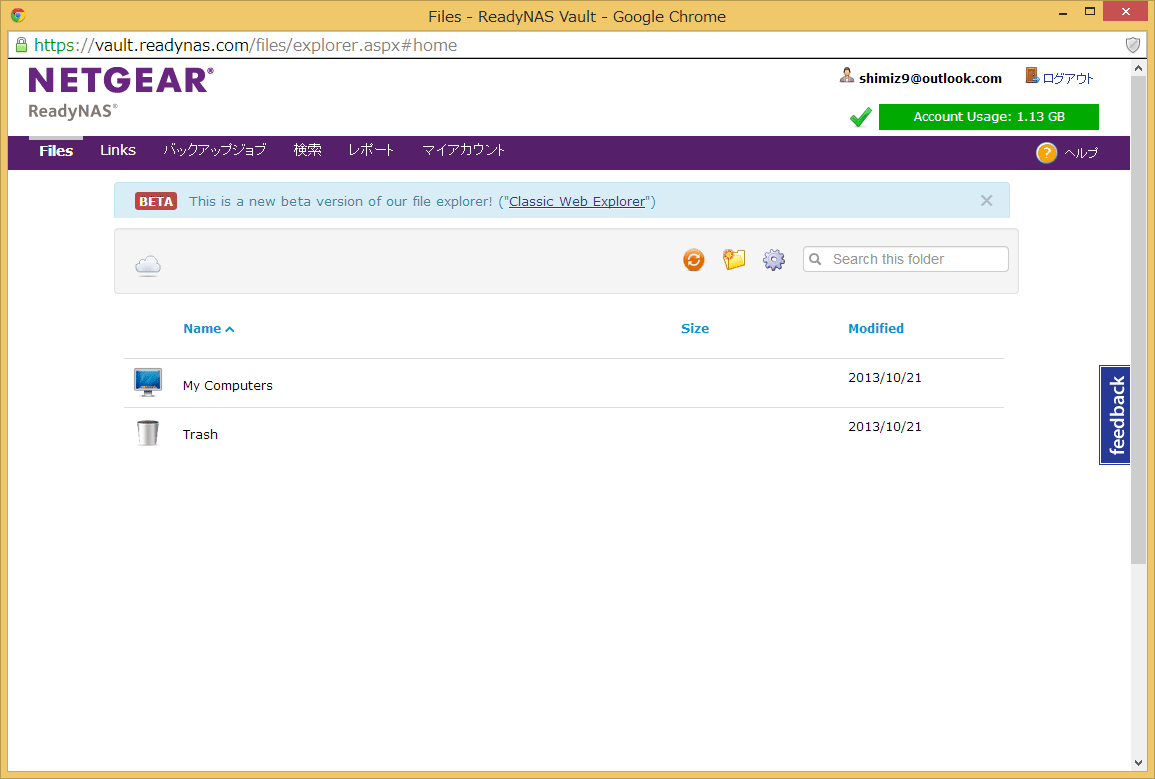 一通り確認できたら、実践編として、バックアップからファイルを復元してみましょう。ファイルの復元は、ReadyNAS Vaultの「Files」ページから実行できますが、現在のベータ版の画面からは、フォルダ単位でのリストアのみとなりますので、「Files」ページの画面に表示されている「Classic Web Explorer」をクリックして、従来版の画面からの操作を紹介します。