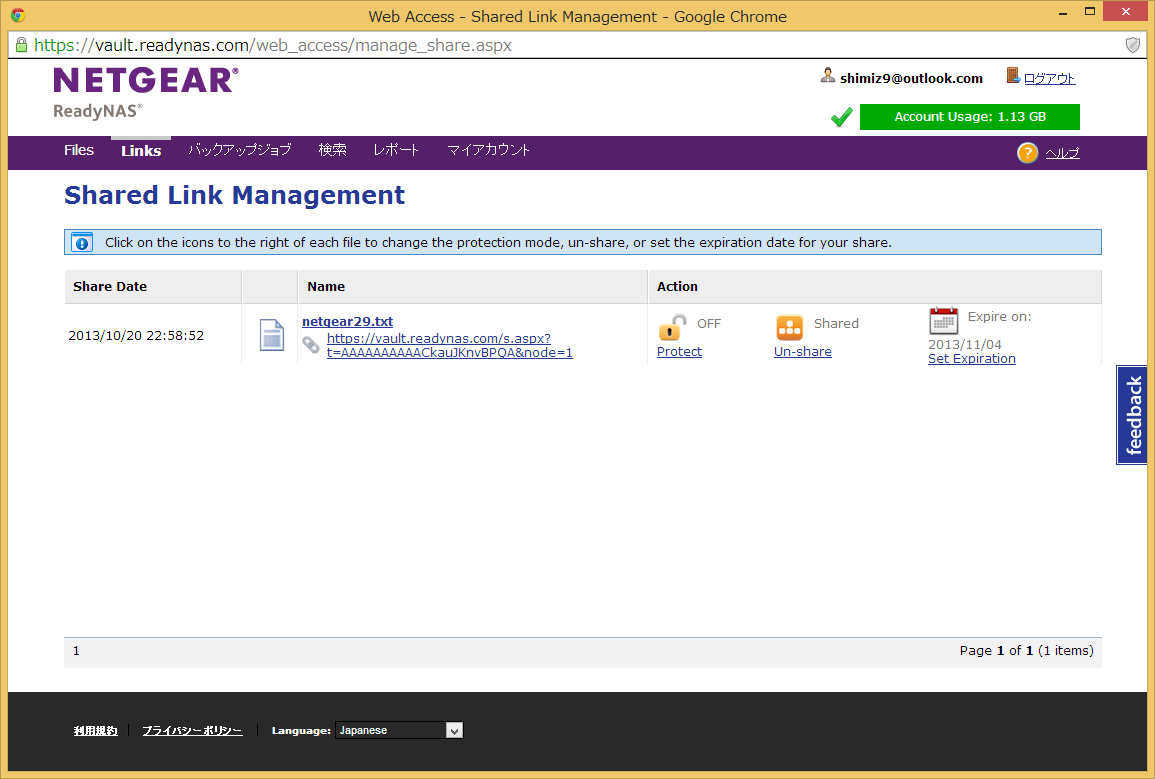 インターネット経由で他の人と共有したファイルを管理するための「Links」ページです。ダウンロードのためのリンクやダウンロードの停止などの管理できます。