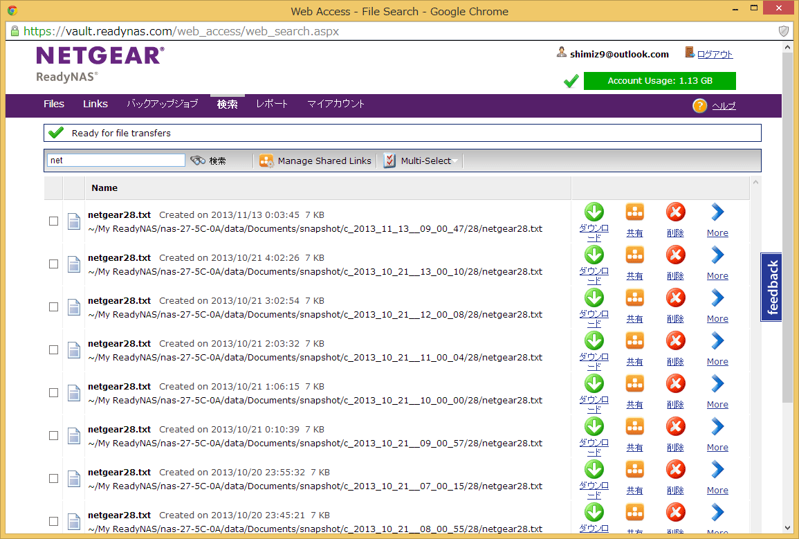 「検索」ページでは、バックアップされたファイルを検索することができます。キーワードを指定すればファイルをリストアップできます。