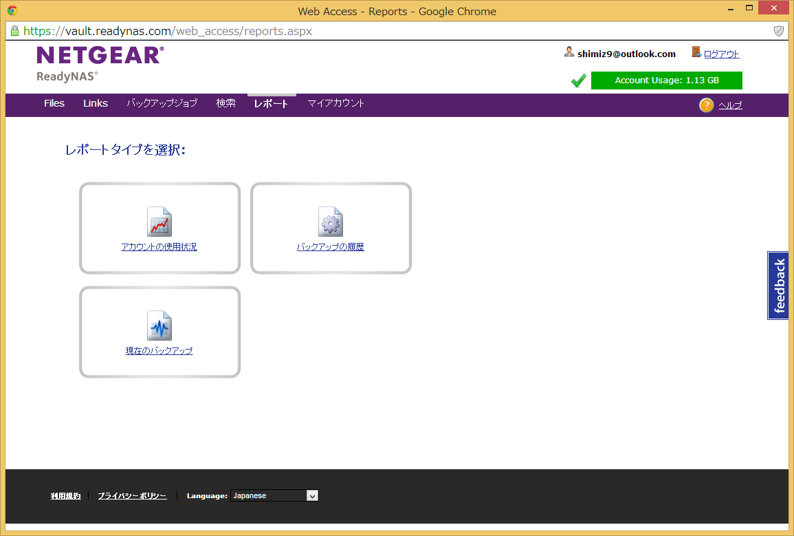 「レポート」は、ReadyNAS Vaultの状況を確認できるページです。ReadyNAS Vaultの容量の使用状況を表示したり、過去のバックアップのレポートやエラーを表示することができます。