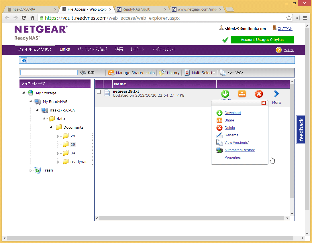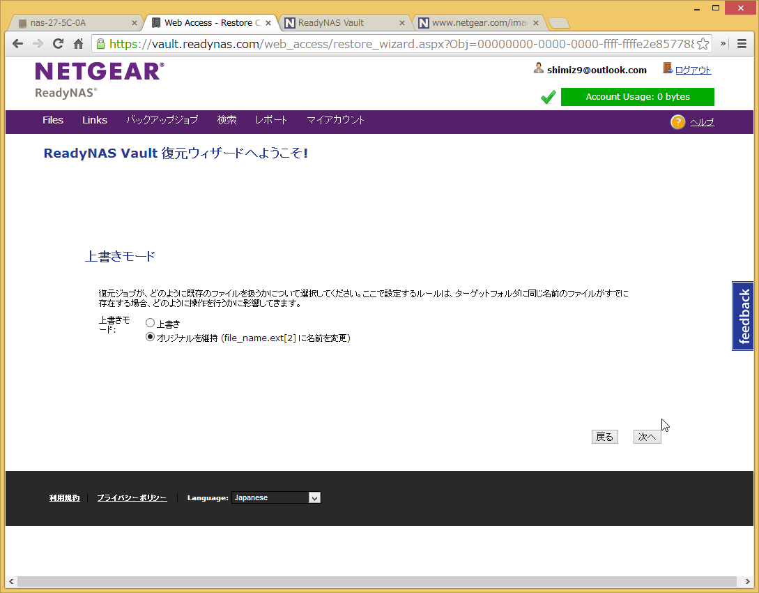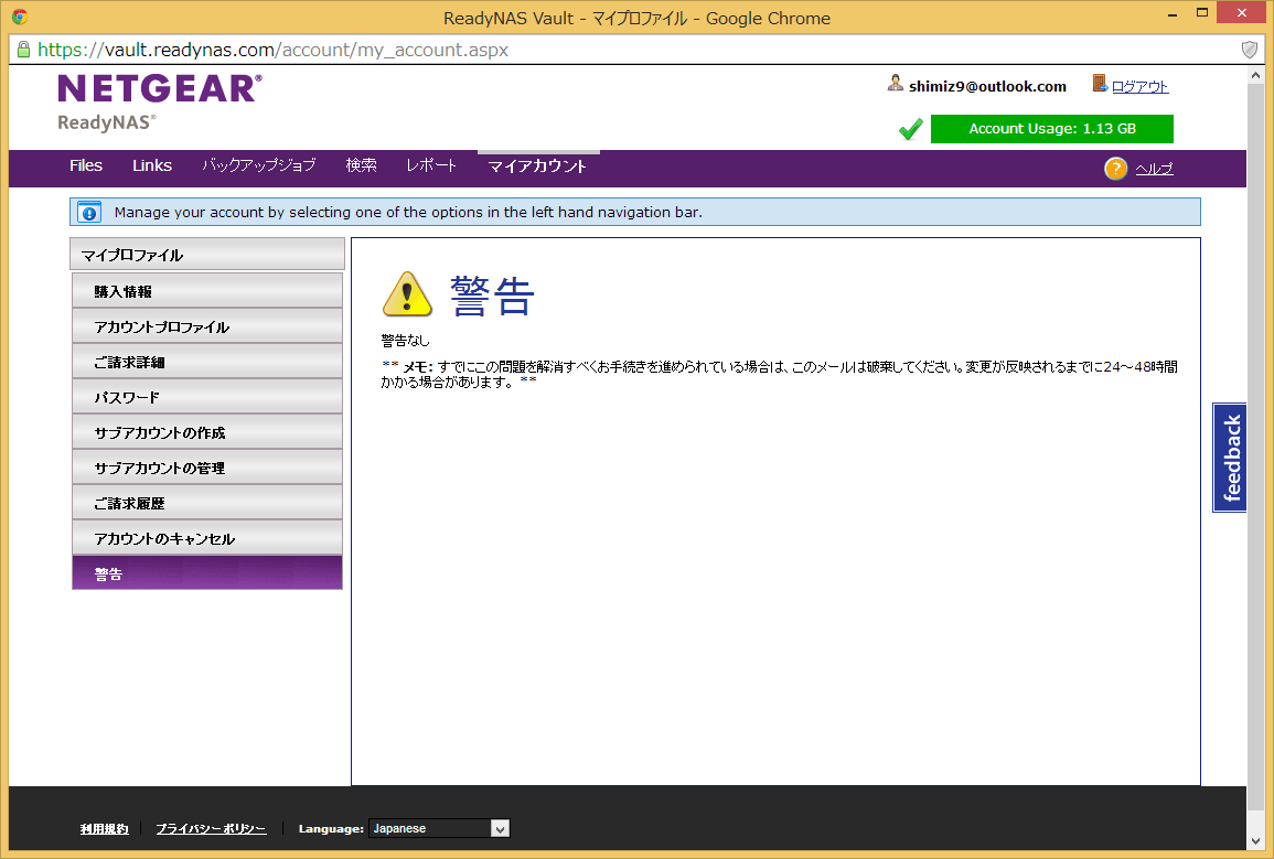 最後の「マイアカウント」はReadyNAS Vaultのアカウント管理画面です。契約情報の確認やサービスのアップグレードなどを実行することができます。