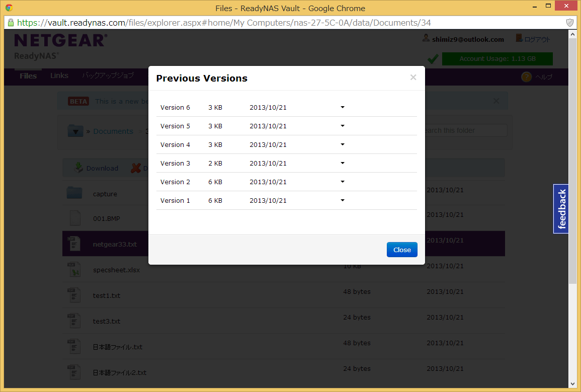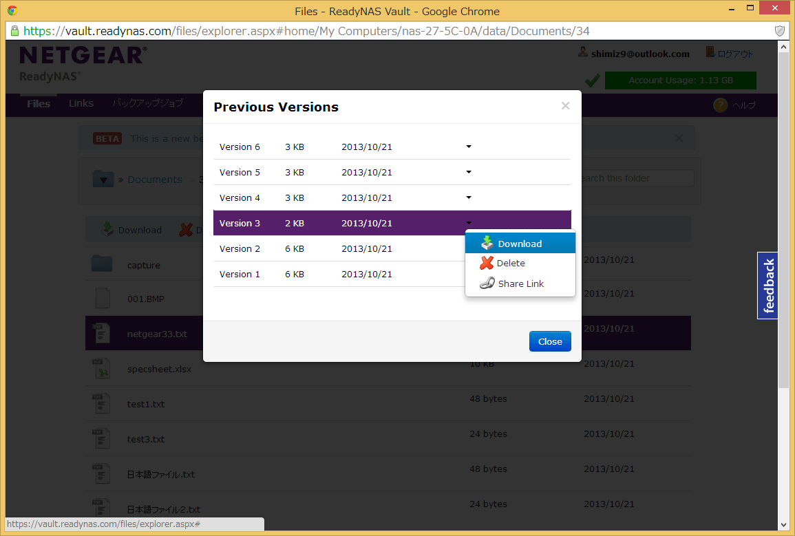 最後に、もう1つ、ReadyNAS Vaultの特長の1つでもあるバージョン管理の機能を見てみましょう。この機能を使うと、自動的に記録されたファイルの更新履歴から、過去のバージョンをダウンロードすることができます。
