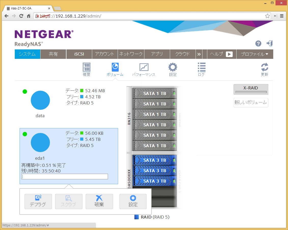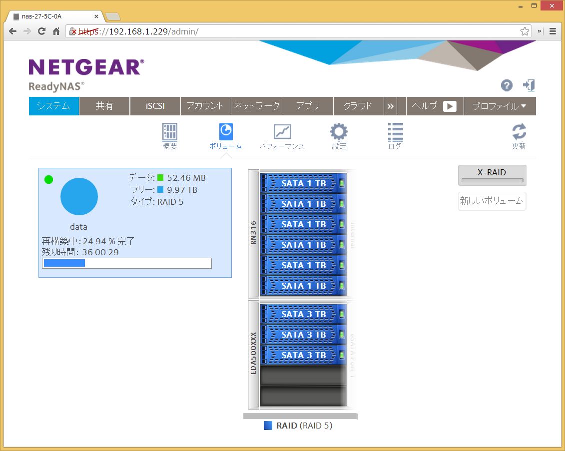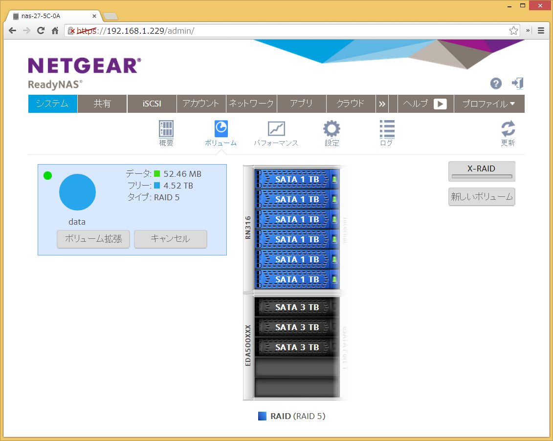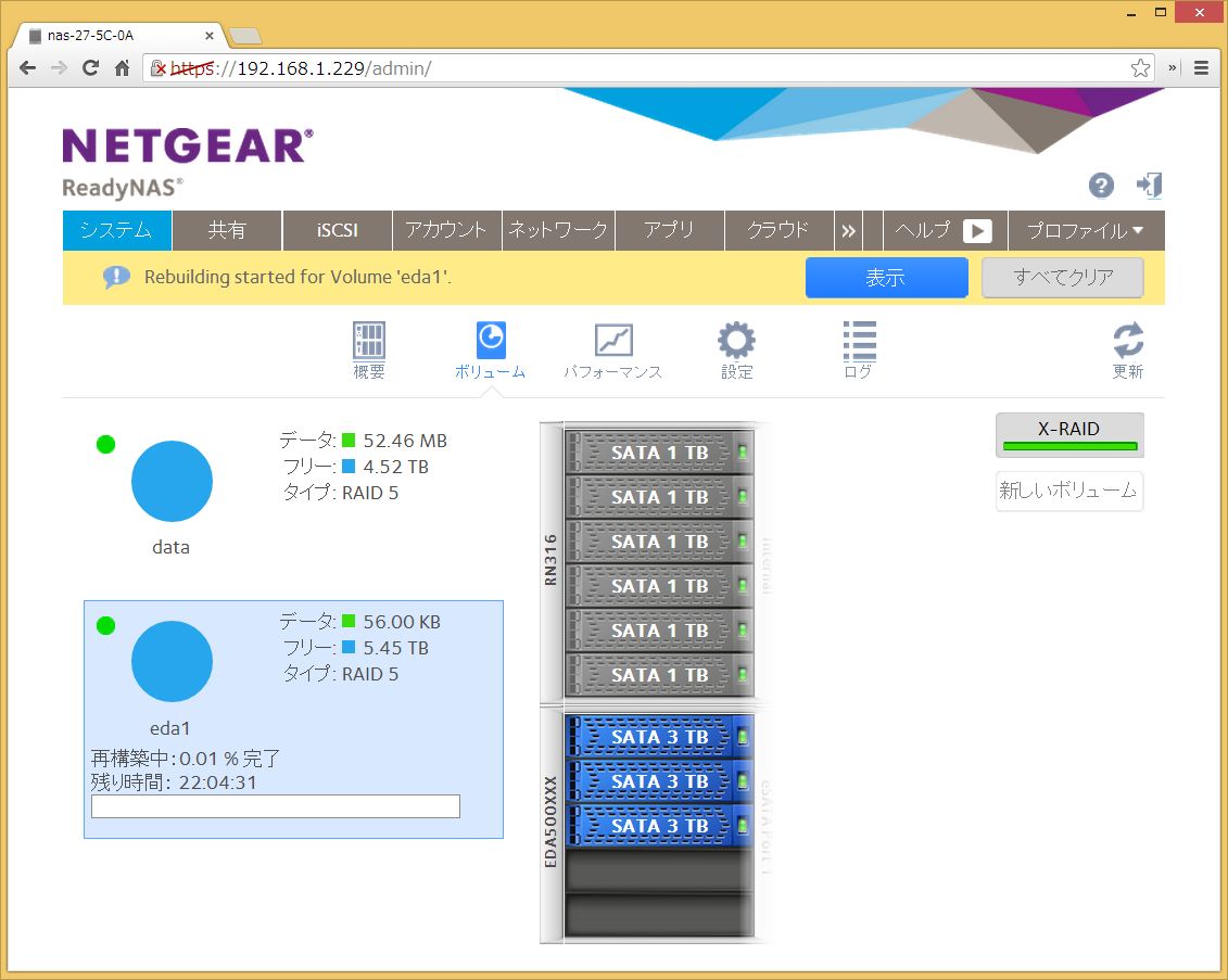 実際に試してみましたが、とても簡単です。ReadyNASにEDA500を接続すると、以下のように、X-RAIDであれば自動的に新しいボリュームとして追加されます。ここに新しい共有フォルダーを作成したり、既存のデータを移動すればいいわけです。