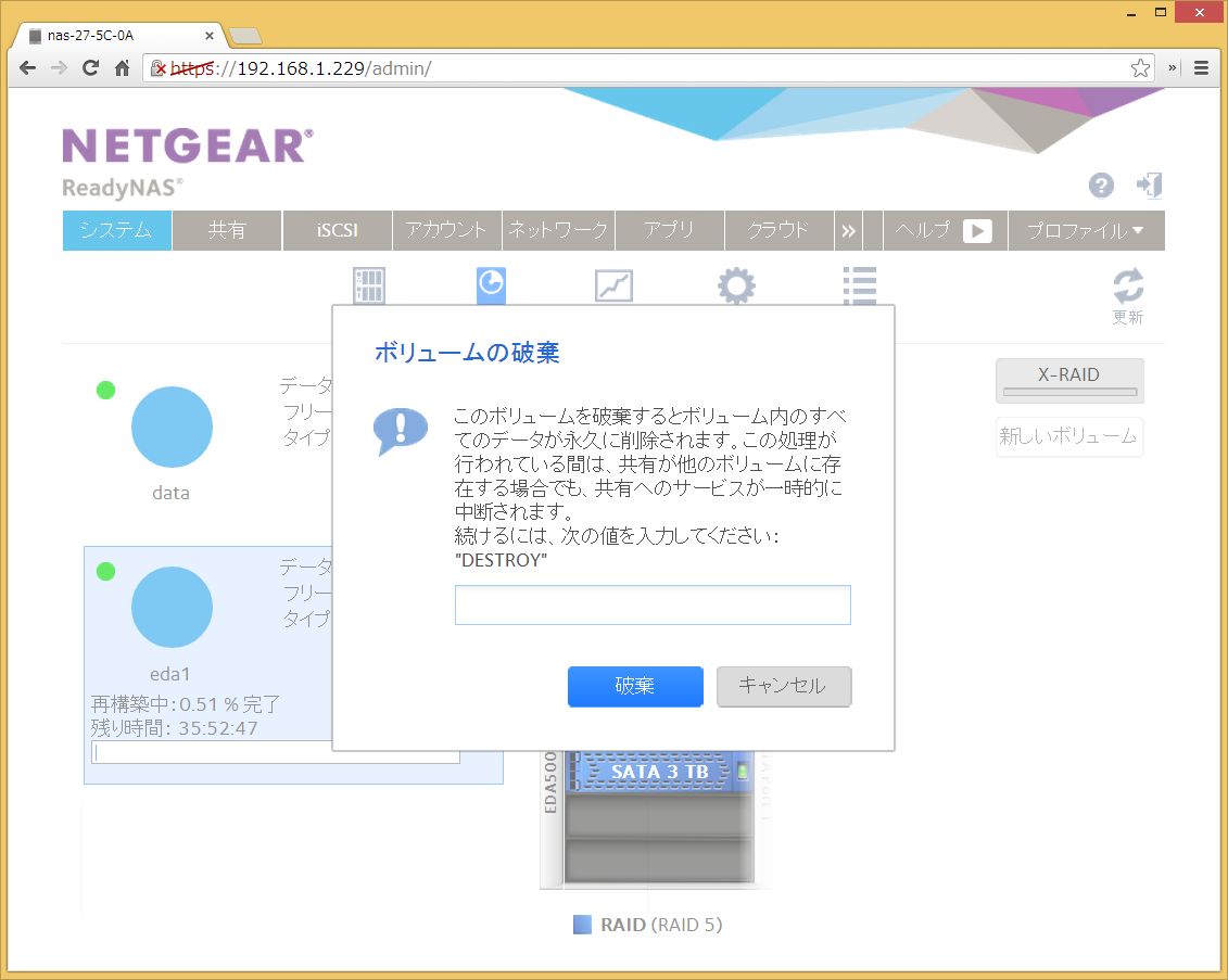 なお、EDA500を接続した状態でReadyNASを初期化した場合も、同様にX-RAIDで2ボリュームが自動的に構成されます。
