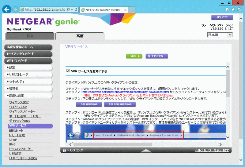左側のメニューから、「高度な設定」-「VPNサービス」の順にクリック。「VPNサービスを有効にする」にチェックを付け、「適用」をクリック。これでサービスが有効になりました