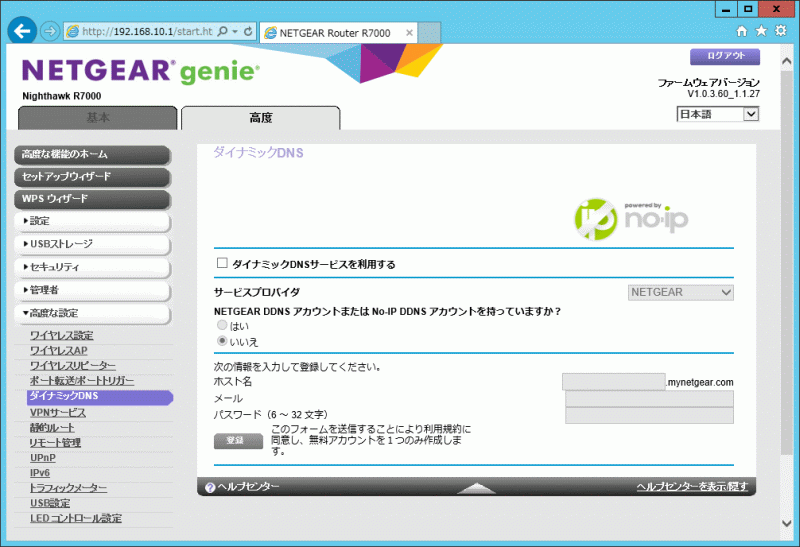 [2]「ダイナミックDNSサービスを利用する」にチェックを付け、「ホスト名」に任意の名前を入力します。この名前を外出先からアクセスするときに指定します。メールアドレスとパスワードを入力したら、「登録」ボタンをクリック