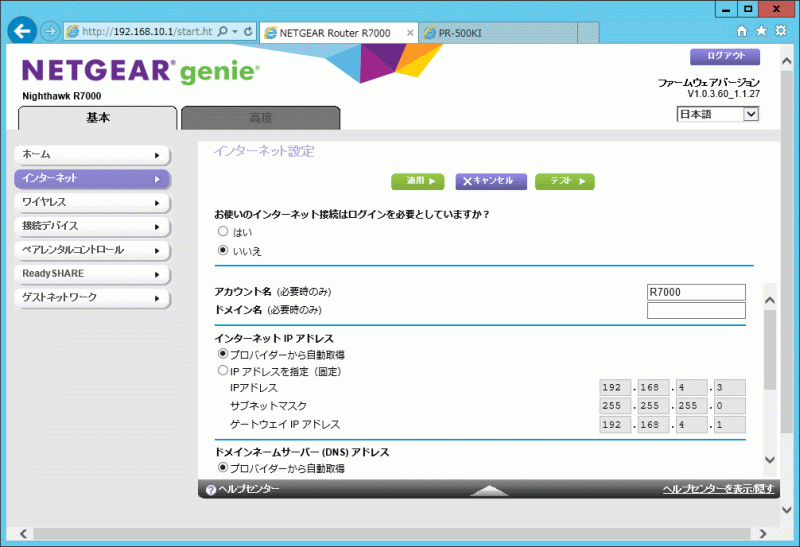 [2]続いて、R7000のIPアドレスを確認します。「基本」タブの「インターネット」をクリックし、WANポートに割り当てられているIPアドレス(ここでは192.168.4.3)をメモします