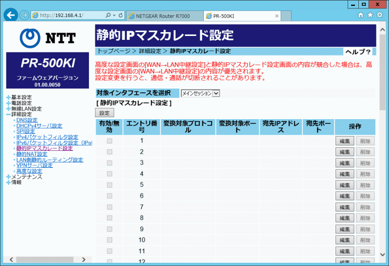 [3]必要な情報をメモしたら、上位のルーター(インターネット接続しているルーター)の設定画面で、「静的IPマスカレード」や「静的NAT」、「ポートフォワード」などの設定画面を表示します
