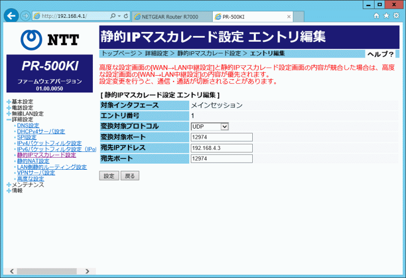 [4]変換対象プロトコルに「UDP」、変換対象ポートにメモしたポート番号(12974)、宛先IPアドレスにR7000のWAN側のIPアドレス(192.168.4.3)、宛先ポートに同じポート番号(12974)を指定して設定を登録します