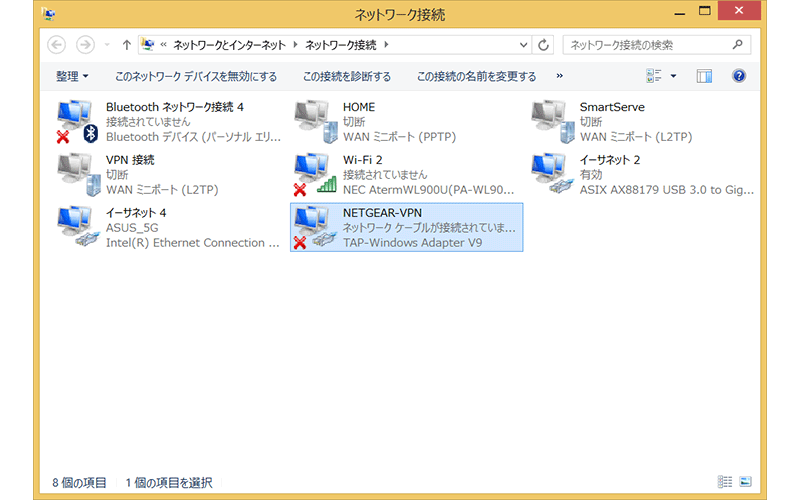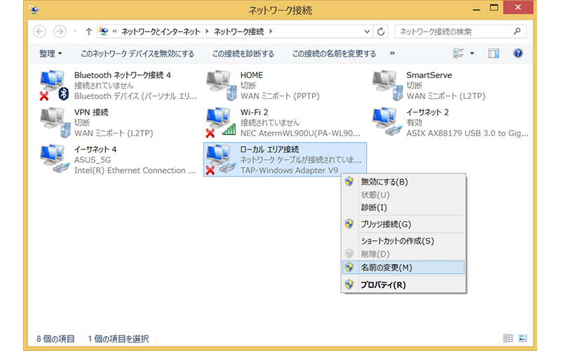 [6]設定ファイルに登録されている情報に合わせて、接続に利用するネットワーク接続の名前を変更します。ネットワーク接続の一覧から、「TAP-Windows Adapter V9」と記載されている接続先を右クリックし、「名前の変更」をクリックします
