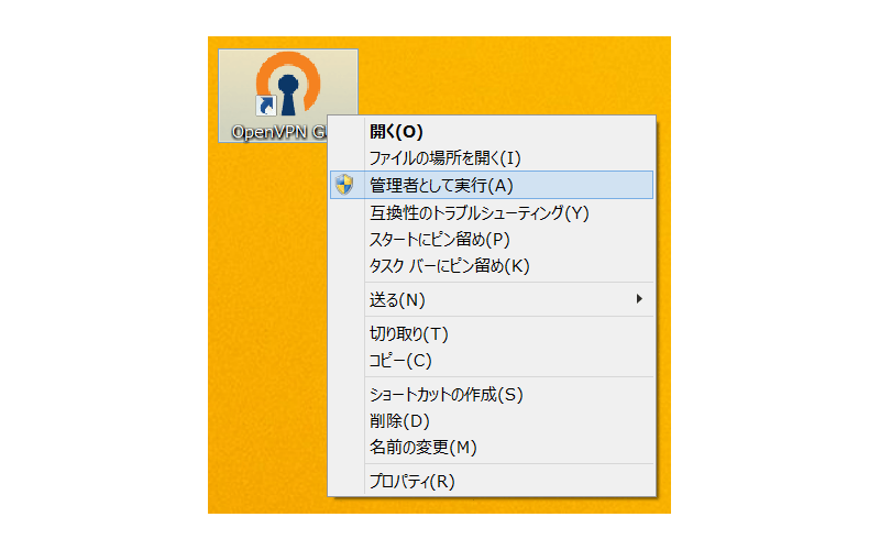 [8]準備ができたら、OpenVPNを起動します。初回は、レジストリへの設定の登録が必要なので、右クリックして「管理者として実行」をクリックします