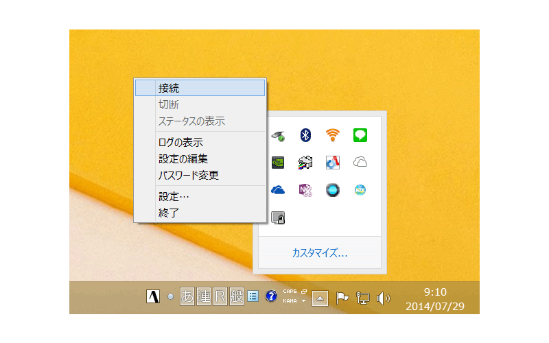 [9]起動したら、通知領域のアイコンを右クリックし「接続」を選択します