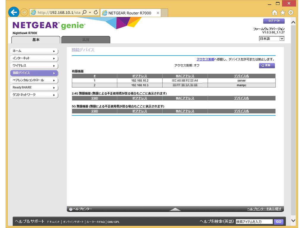R7000の設定画面から「接続デバイス」をクリックすると、LAN上のパソコンの名前やIPアドレスを確認できる