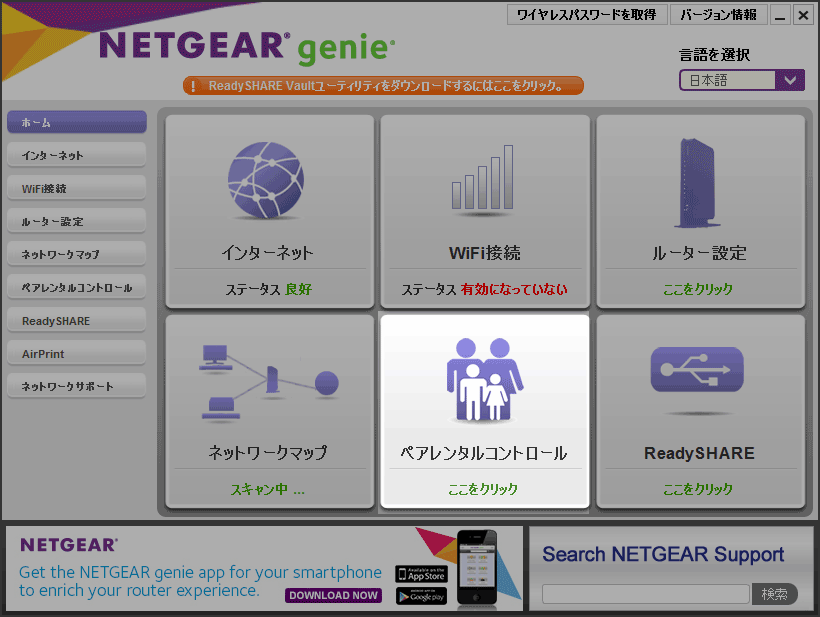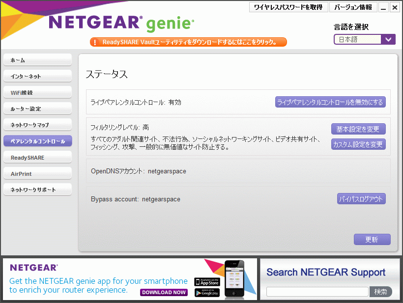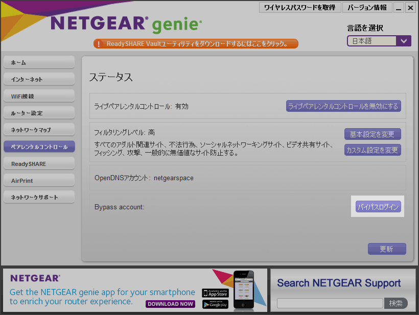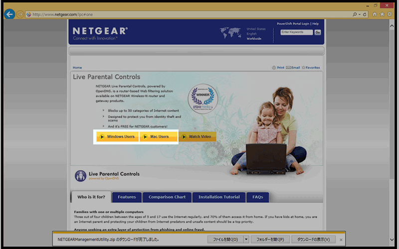 まずは、R7000でペアレンタルコントロール機能を有効にします。保護者のパソコンから設定ページにアクセスし、設定用のプログラム「NETGEAR Live Parental Contorols Management Utility」をダウンロードします。