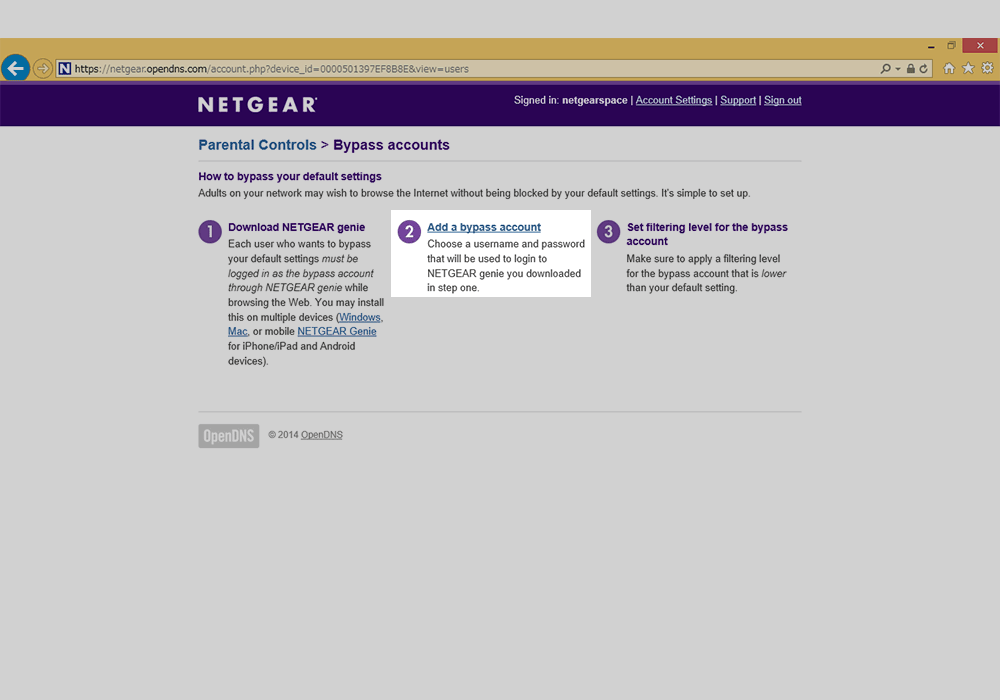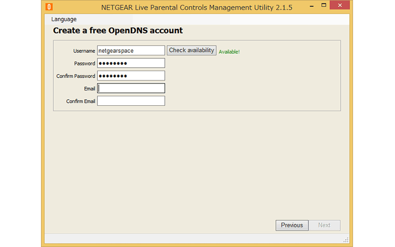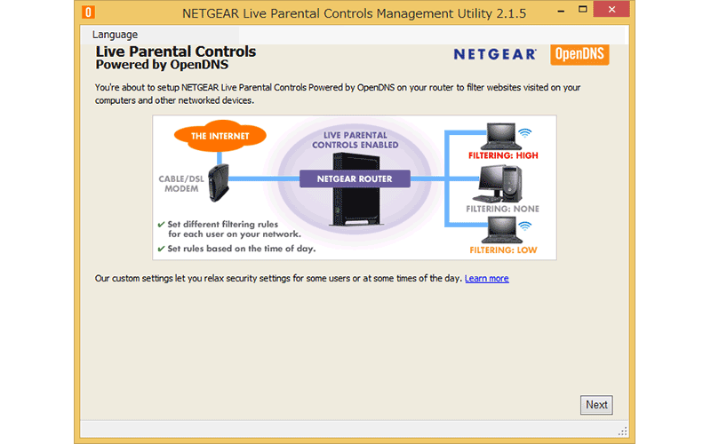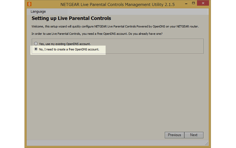 [6]ペアレンタルコントロールは、「OpenDNS」と呼ばれるDNSサービスを利用して、インターネット上のサイトへの接続を制御します。利用には無料のアカウントが必要なので、「No,I need to create a free OpenDNS account」を選択して「Next」をクリックします