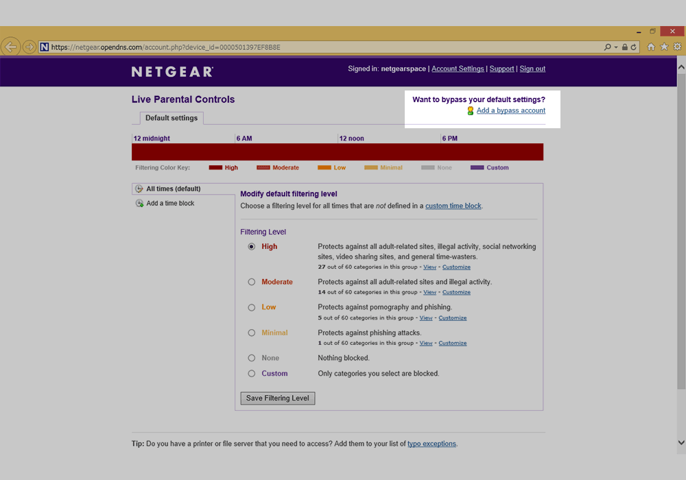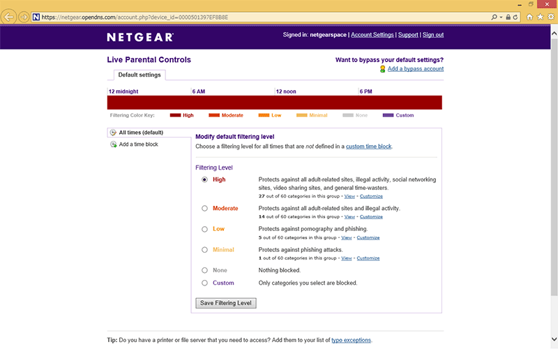 ネットギア製品のペアレンタルコントロール機能は、子どもの端末だけでなく、無線LANで接続するすべての端末に対して設定したフィルタを適用します。このため、保護者が使うパソコンやスマートフォンなど、フィルタリングを適用したくない端末は、バイパスの設定が必要となります。