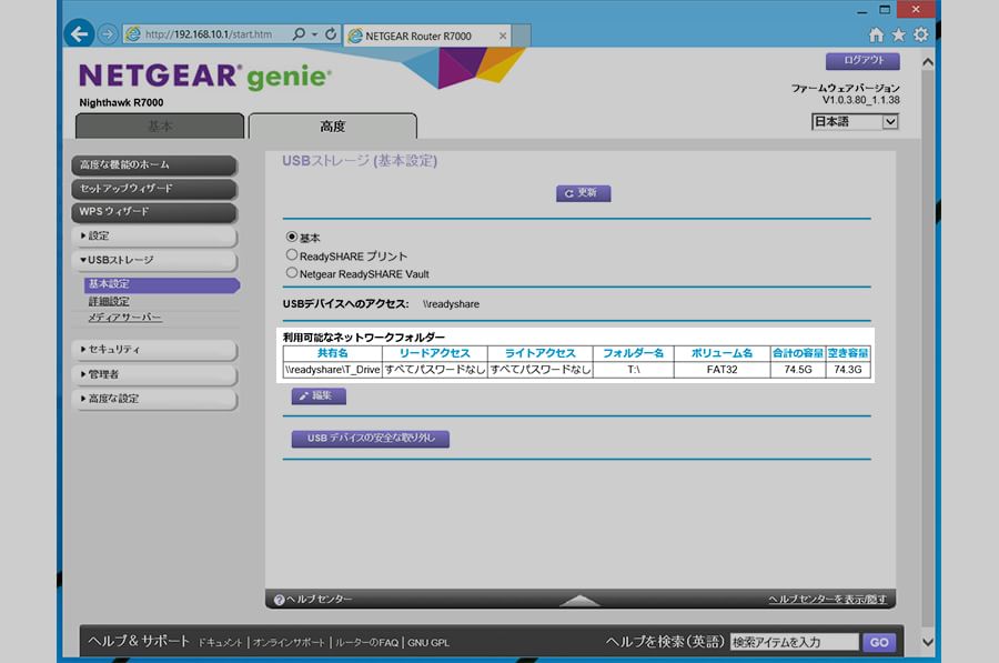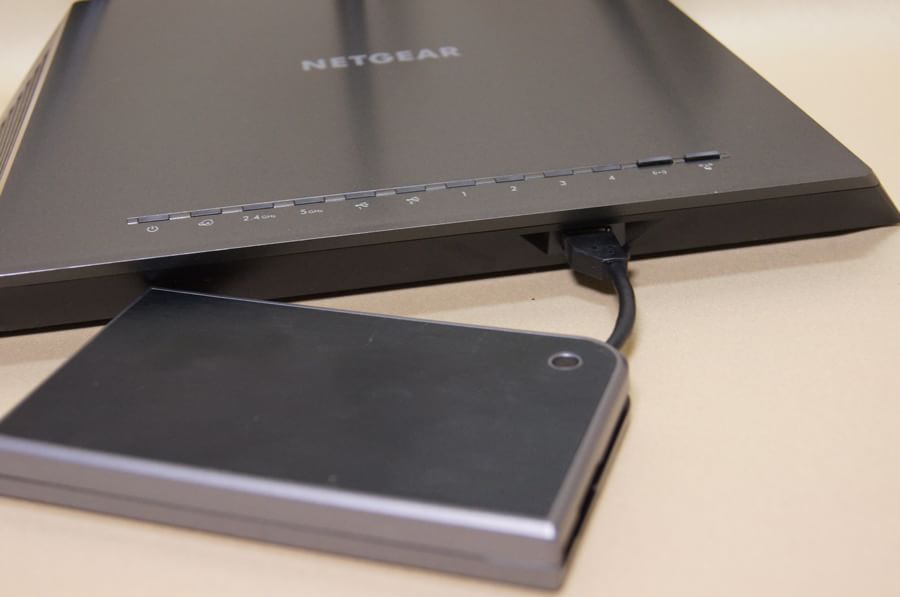 まずはR7000の準備をします。設置後にUSBポートにUSB HDDなどのストレージを装着します。これが音楽データを保存するための領域となるので、共有設定を有効後、音楽データをコピーしておきましょう。