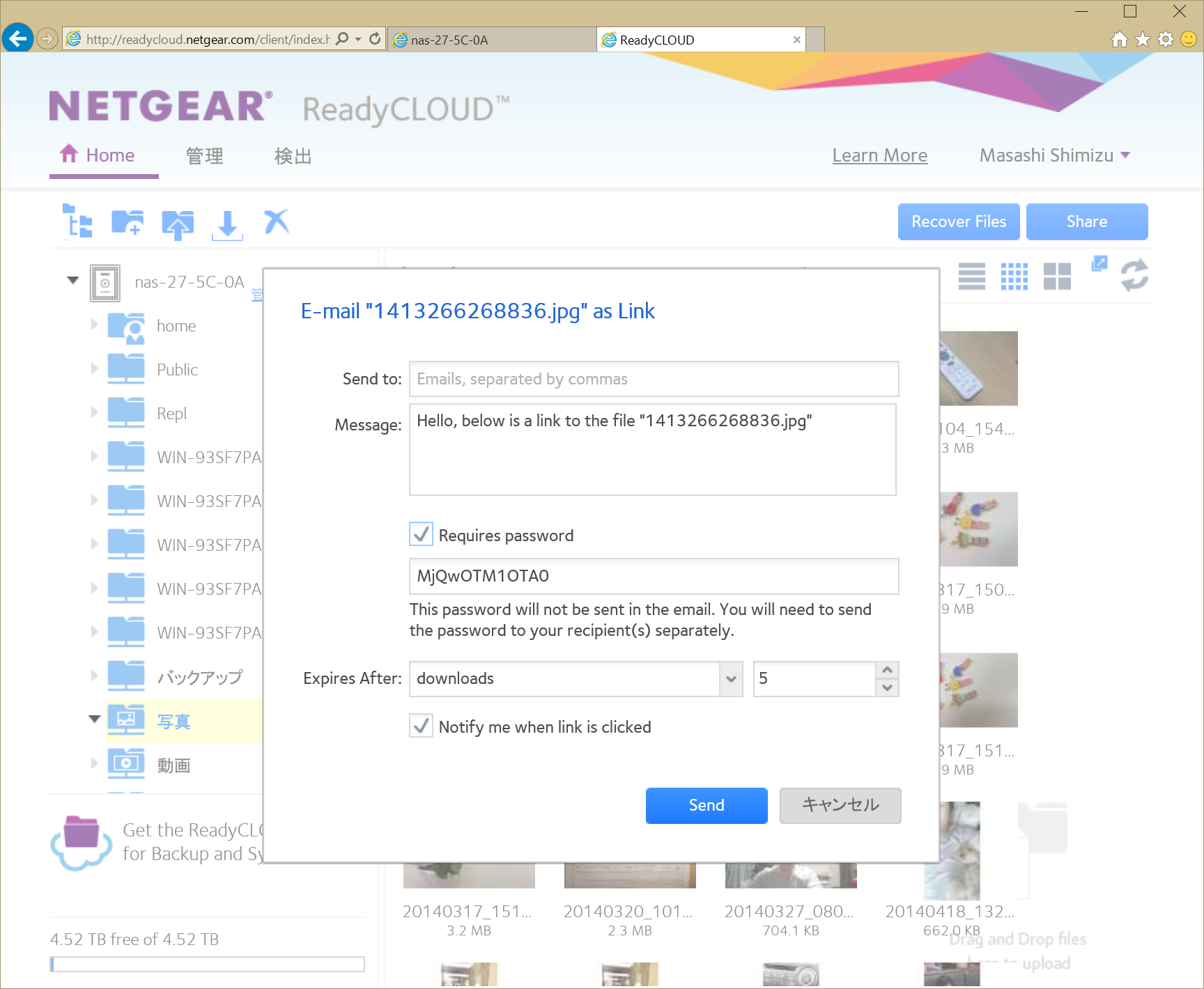 一般的なファイル転送サービスの場合、ファイルのURLを送信したはいいが、果たして相手が無事にファイルを入手したのかどうかがわからない場合が多い。法人向けのサービスなどでは、こういった通知機能が使える場合があるが、ReadyNASであれば、無料で通知を受け取ることができる。