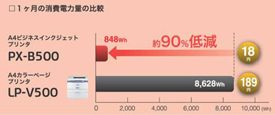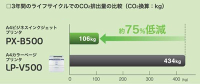 紙やインクの使用量が少ないということは、コストだけでなく、エコロジーにもつながるが、そもそもインクジェットプリンターは電子写真方式のレーザープリンターに比べて熱使用が少ないため、消費電力やC02排出量も少ないという特徴があり、環境対策としての導入効果も非常に大きい。