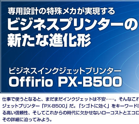 そこで注目したいのが、高生産性、高信頼性、ローコスト、エコロジーと「シゴト」に求められるニーズを徹底的に分析し、これまでのインクジェットプリンターの弱点と言われていた課題をことごとく解消したエプソンのビジネスインクジェットプリンター「PX-B500」だ。「ビジネスにはビジネスの」そんなコダワリさえ感じさせるビジネス利用に特化した製品だ。