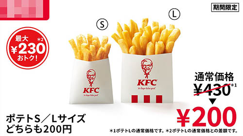 ケンタッキーがポテト最大半額以下のクーポンを配信! ポテトS/Lサイズが各税込200円