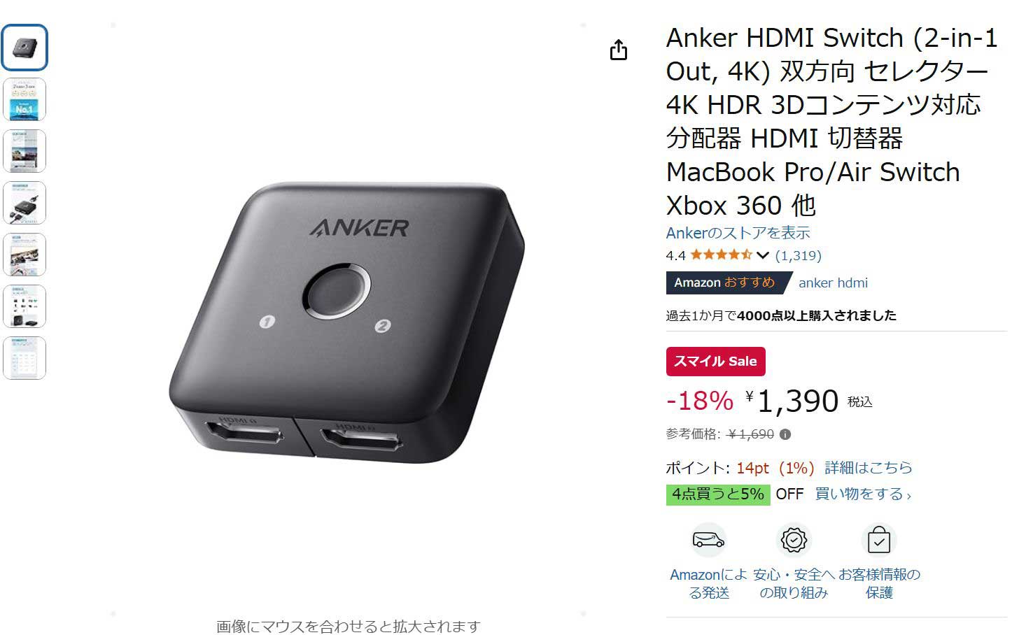 AnkerのHDMI切替器が18% OFFの1390円。スマイルSALE 新生活FINAL