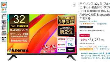 ハイセンスの32型フルHDテレビが16% OFFに。Amazonタイムセール
