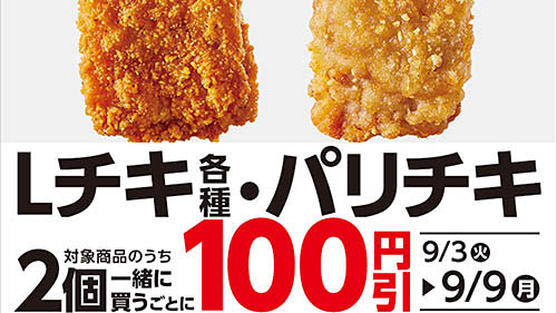 「Lチキ」各種・「パリチキ」を2個一緒に買うと税込100円引! ローソンがセールを開催中
