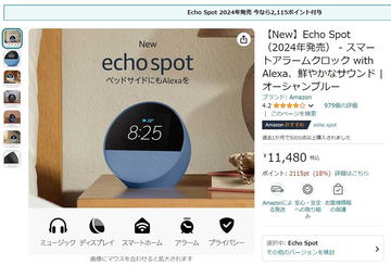 Amazon「Echo Spot」購入で2115ポイント付与。実質9365円に