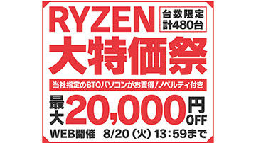パソコン工房、BTO PCが最大2万円オフの「RYZEN 大特価祭」を実施中
