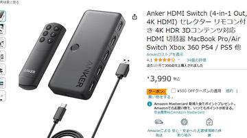 Anker「4入力1出力 HDMI切替器」に500円OFFクーポン