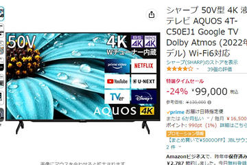 Amazonでシャープ50型AQUOS「EJ1」24% OFFの99,000円。42型は8万円