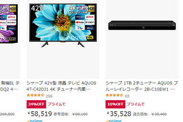 Amazonでシャープ42型AQUOS「4T-C42DJ1」34% OFFの58,519円