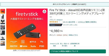 Fire TV Stick購入で1,000円分のポイント。3月12日まで
