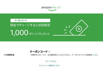 Amazonギフトカード、現金チャージで1,000ポイントプレゼント。初回限定