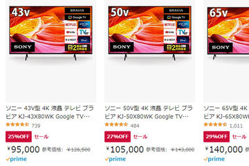 Amazonでソニー4Kブラビア「X80WK」最大30% OFF。50型105,000円