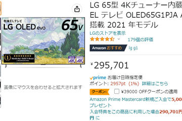「Amazonクーポンフェスタ」でLG 65型有機ELテレビが39,000円OFF