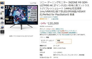 ソニー「INZONE M9」がセール。Amazonは14%オフ