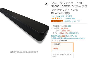 Amazonで、ソニーのサウンドバーが1万円を切る8,980円に