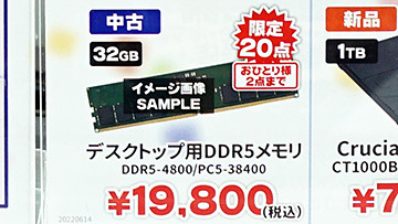 DDR5-4800メモリ32GBが19,800円!じゃんぱらD-Style秋葉原店で中古セール