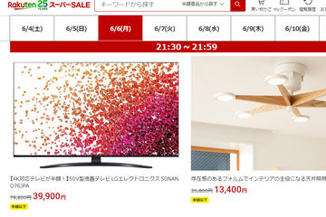 楽天スーパーSALE。6日は50型液晶テレビやBDレコーダーが半額