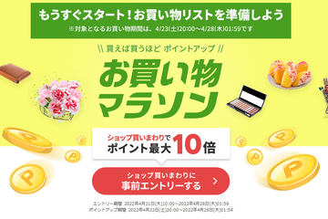 楽天「お買い物マラソン」4月後半は23日20時から。割引クーポンも